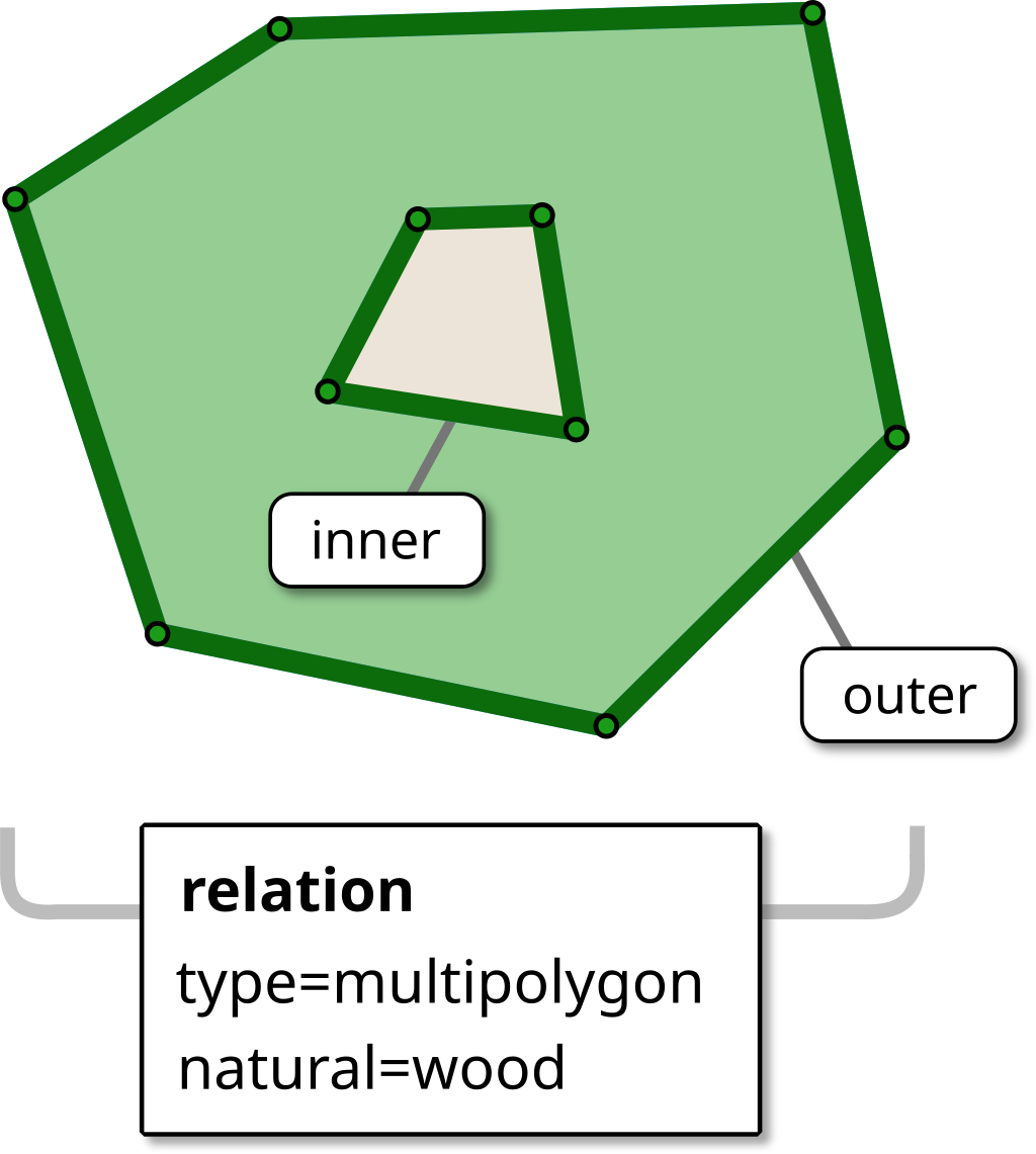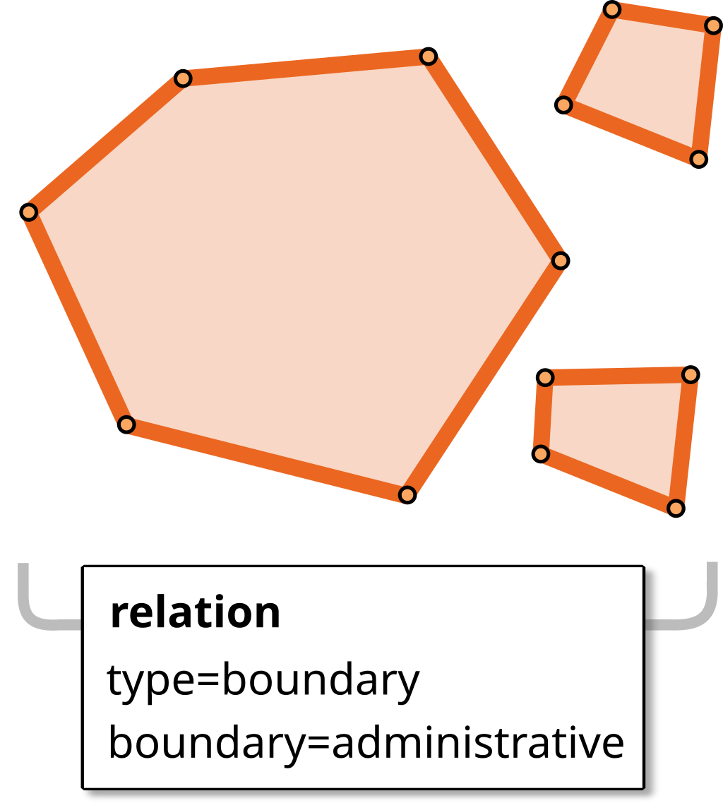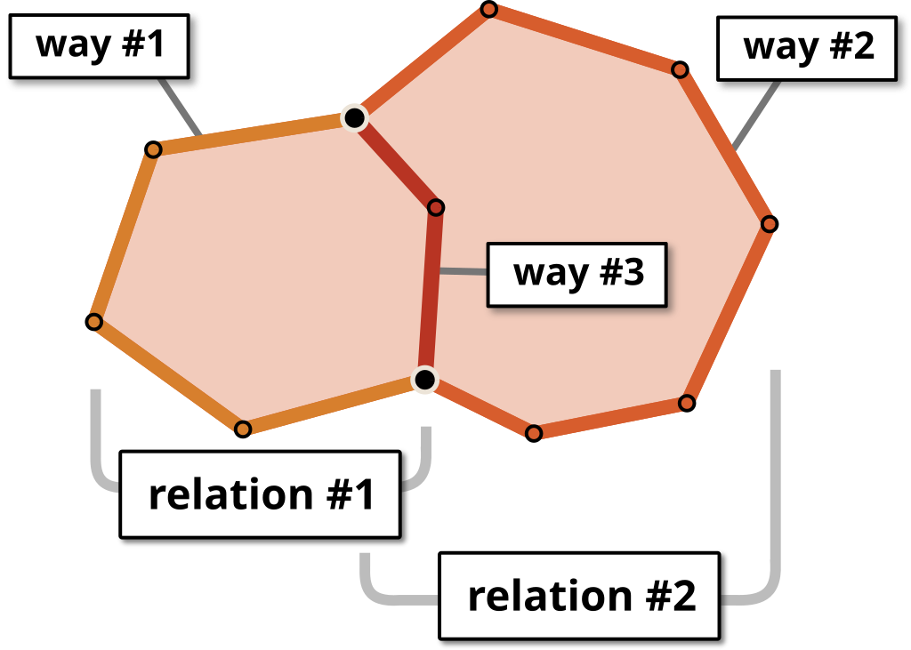 The OSM data model has a third kind of elements — relations — which combine multiple elements into more complex structures. A relation can contain any combination of nodes, ways, and other relations. Each member can have an optional role.