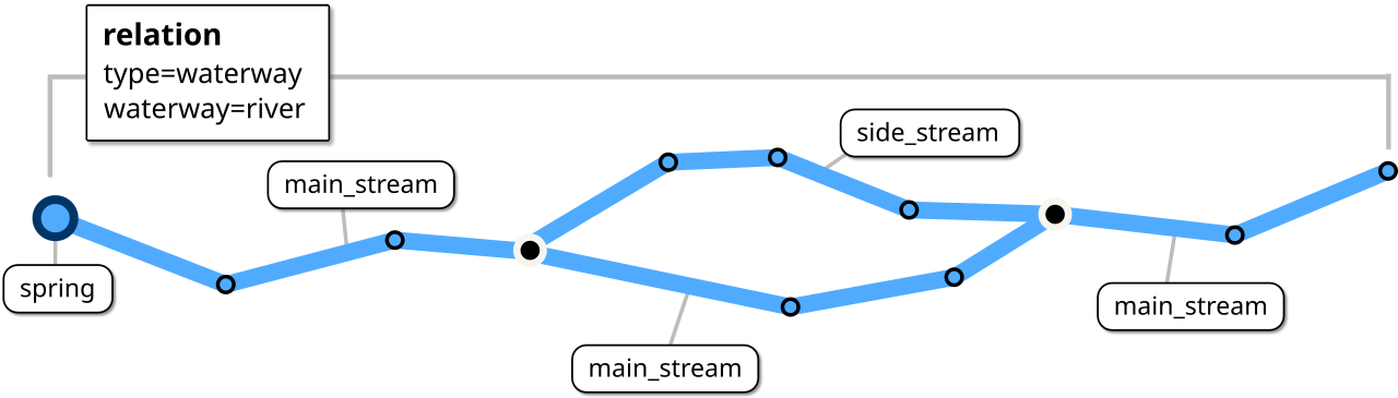 Relations are also used to build complex non-polygonal structures, such as a river that splits into multiple branches. Here’s an example of a river composed of multiple ways — the roles main_stream