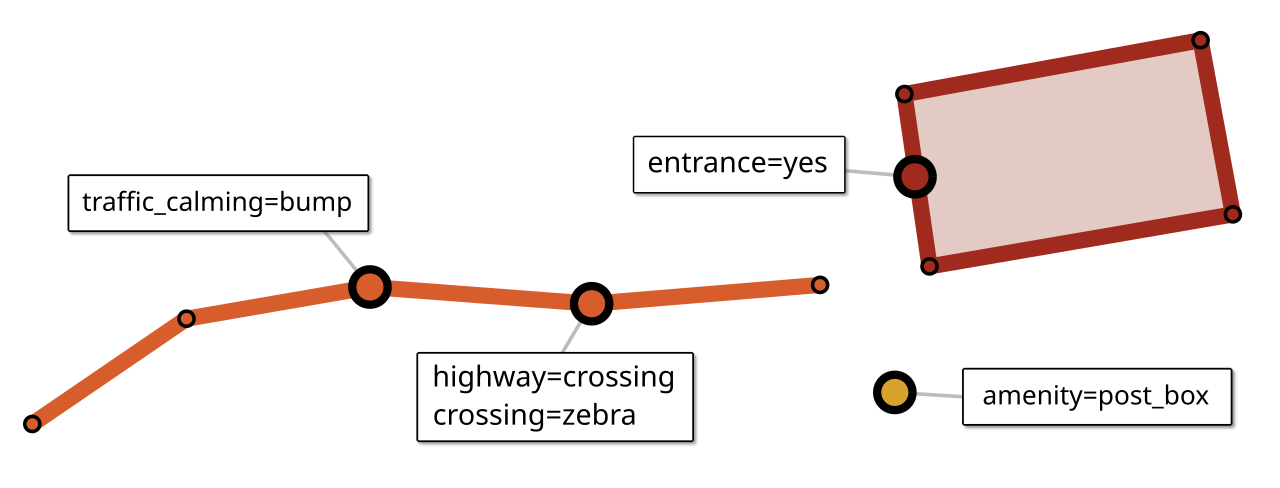 The majority of nodes exist only to define the geometry of ways, but many nodes represent distinct features. These feature nodes can be part of ways — a speed bump along a road, or the entrance of a building — or can stand alone, marking features that are too small to be drawn as polygons: mailboxes, streetlamps, fire hydrants.