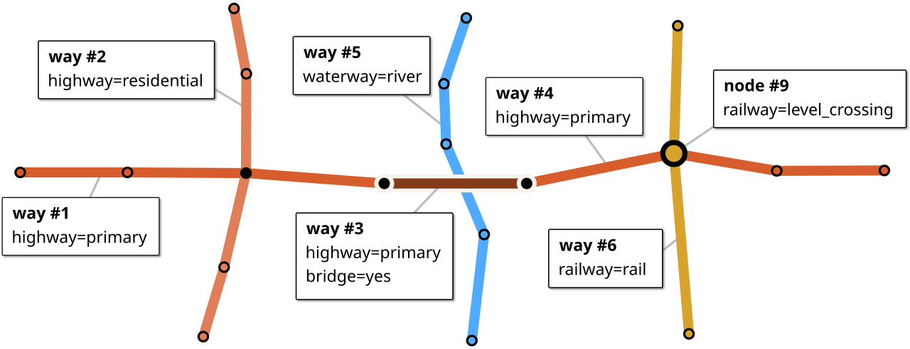 Nodes and ways can have one or more tags — key-value attributes that describe what kind of geographic feature an element represents (a street, a lake, a shop), as well as additional details (speed limit, depth, opening hours). This OSM page lists how various features are mapped.